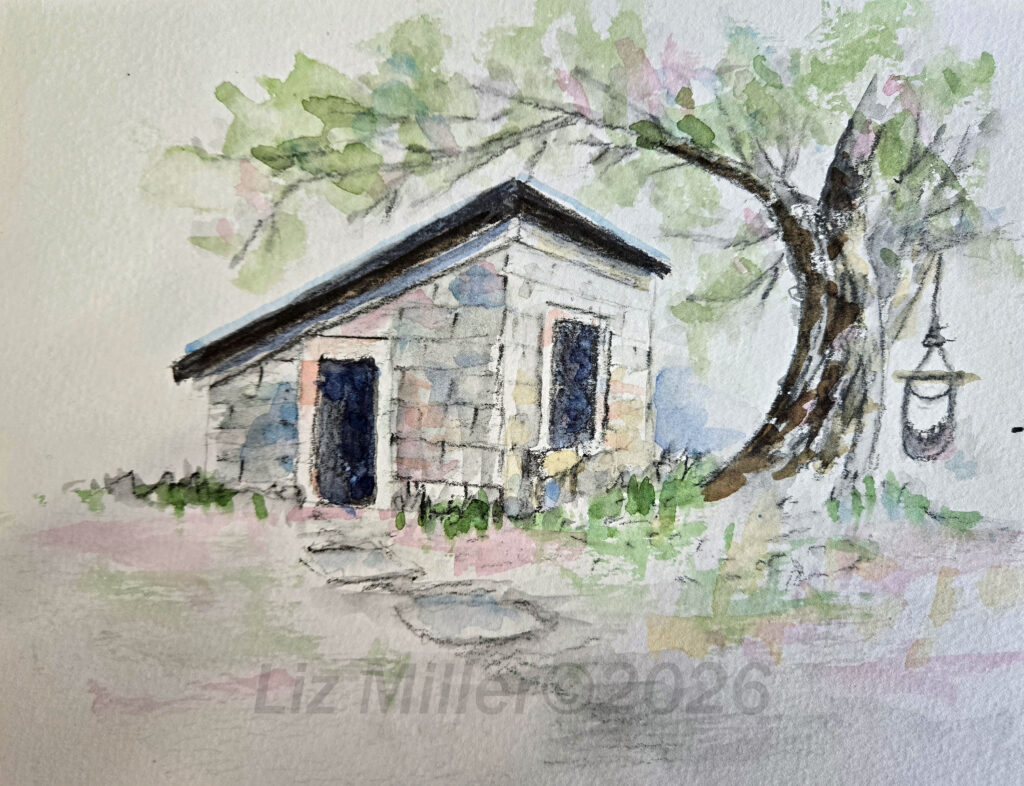 We discussed in our last class what students would like to explore next and here it is. This is the Old Laundry, a building on the farm where I live, that I have sketched with the General Sketch and Wash pencil which is water soluble. Once I have my values set I then added color with a few watercolors. Such fun and easy.